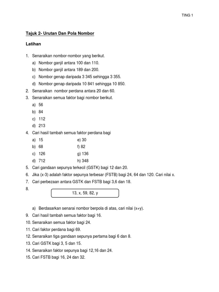 1 ialah faktor sepunya bagi semua nombor. Aii Semua pentagon mempunyai lima sisi. 1 Nombor berikut mempunyai 3 sebagai faktor perdana kecuali a 180 b 210 c 280 d 567 2 Pasangan nombor berikut mempunyai 12 dan 4 sebagai faktor sepunya kecuali a 1624 b 1628 c 1820 d 2024 3 Antara berikut yang manakah gandaan sepunya bagi 16 dan 24.